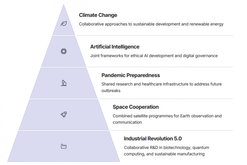 Potential areas for collaboration include climate change, renewable energy, artificial intelligence, digital governance, pandemic preparedness, healthcare infrastructure, space cooperation, biotechnology, quantum computing, and sustainable manufacturing.