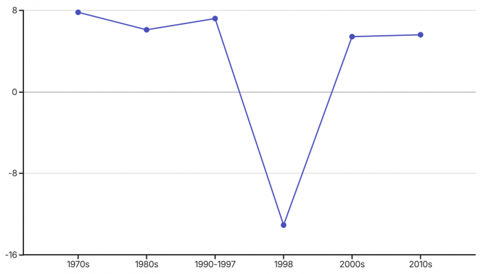 However, this progress was accompanied by corruption, cronyism, and unsustainable economic practices. These weaknesses contributed to Indonesia’s severe collapse during the 1997-98 Asian Financial Crisis. The rupiah lost 80% of its value, inflation rose to 78%, and GDP contracted by 13.1%.