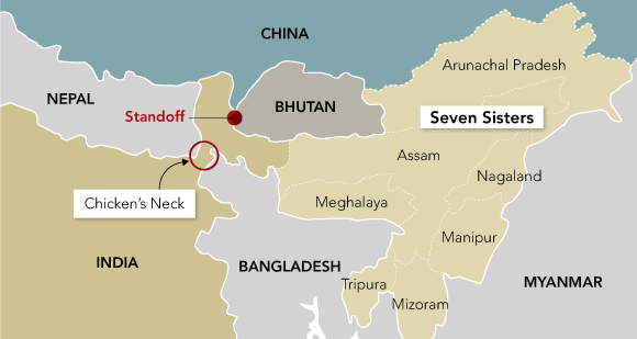 Control of Mount Gipmochi (which is China’s claim point as the India-China-Bhutan trijunction) would give the Chinese a strategic vantage right into the Silliguri Corridor. It is unlikely that the Royal Bhutanese Army stationed on the Jhampheri ridge would be able to offer much resistance. The distance between the claim points of Bhutan and China is nearly 5-6km apart. Such a distance could give the Chinese immense advantages in artillery fire on the narrow corridor. It is important to remember that currently as things stand, only a single railway line passes through the corridor and is the link between mainland India and its north eastern states.