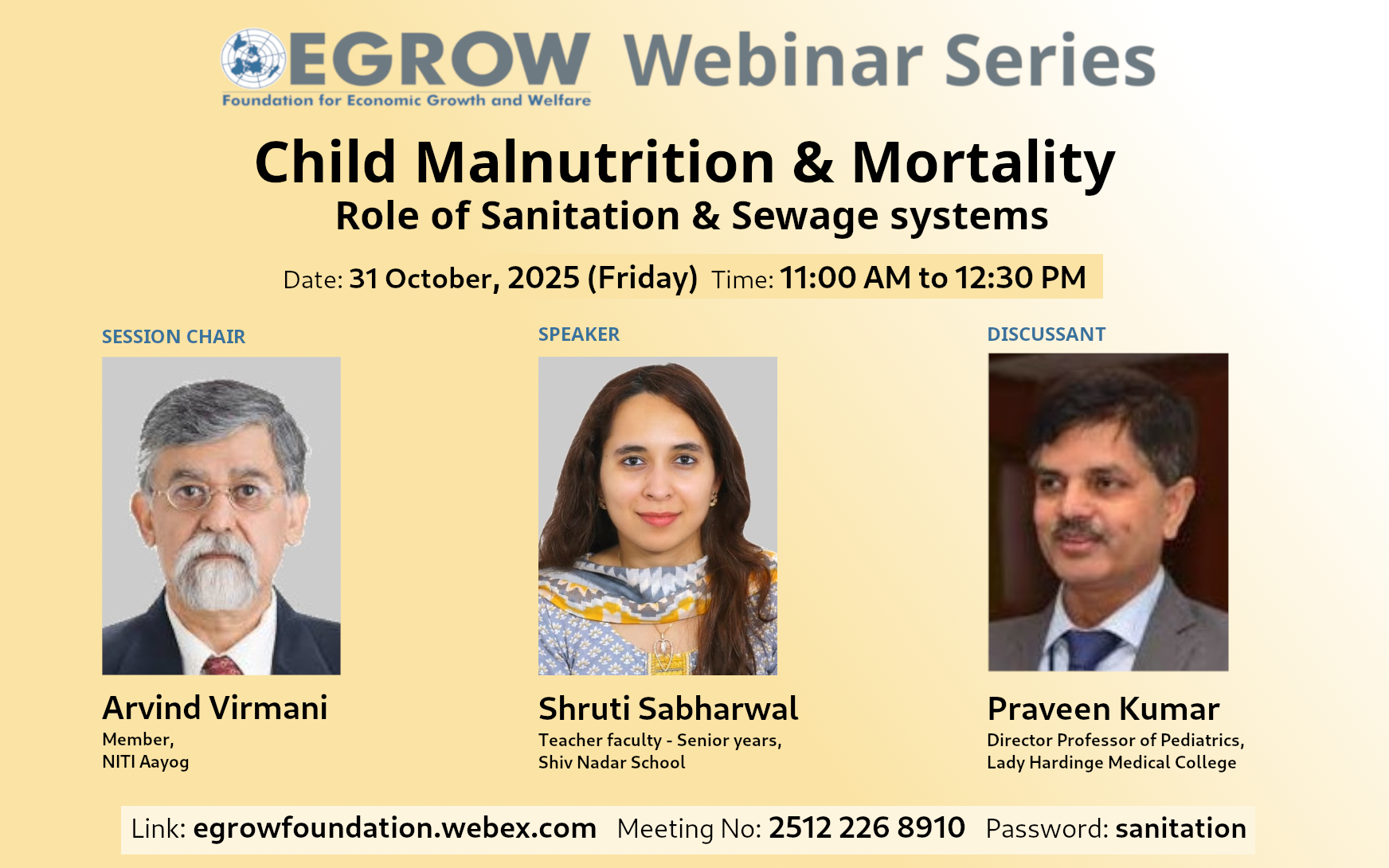 Child malnutrition and child mortality remain persistent public-health challenges in developing economies, despite gains in income, food access and healthcare. Evidence increasingly shows that inadequate sanitation and unsafe sewage disposal are fundamental drivers of poor child health. Open defecation and mismanaged human waste increase exposure to pathogens, fuelling chronic infections and environmental enteric dysfunction that undermine nutrient absorption and immunity. These biological pathways link sanitation deficits to undernutrition and higher risk of early death. Beyond infrastructure gaps, behavioural and social factors — including toilet-sharing norms, hygiene practice and maternal education — shape the realised health impact of sanitation. The policy frontier lies in coupling toilet coverage with sewage quality, integrating sanitation with nutrition–health programmes, and sustaining behaviour change through education. The webinar will deliberate on concrete, scalable and coordinated policy actions in sanitation quality which spans not only infrastructure but also behaviour change and institutional delivery.