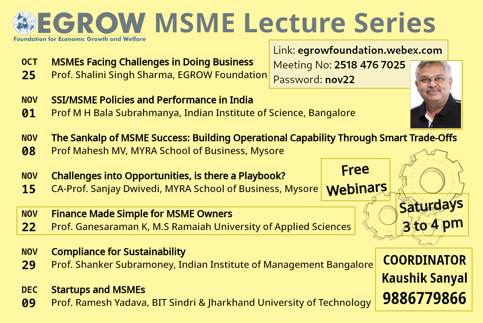 Dr. Ganesaraman will talk about finance made simpler for MSME owners that aims to empower entrepreneurs to understand and manage their business finances with confidence. The session translates financial concepts into practical insights, covering budgeting, funding, and cash flow, enabling MSME owners to make informed decisions that drive growth and long-term sustainability.