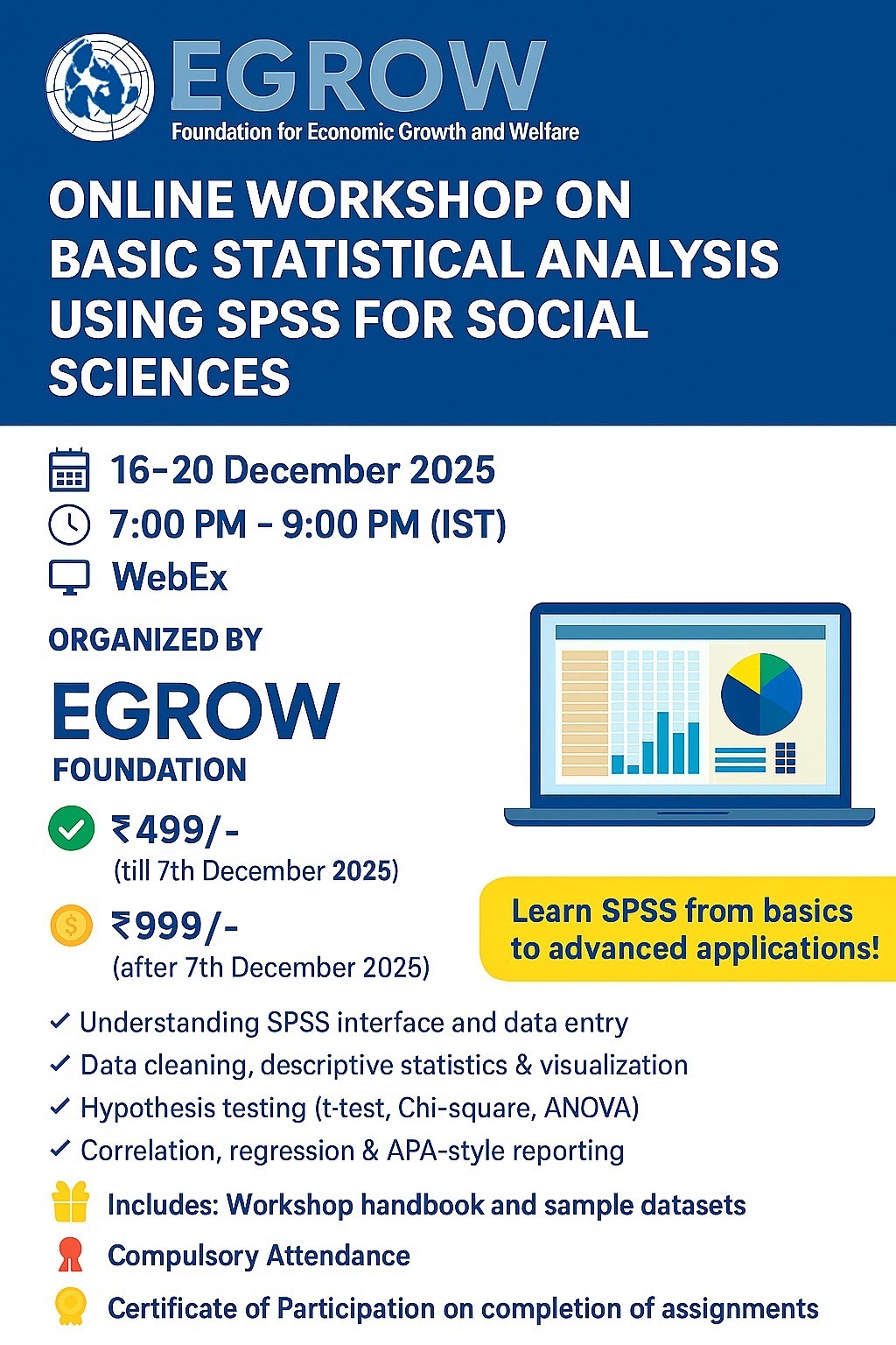 The EGROW Foundation proudly presents a comprehensive five-day online workshop designed to help participants from the sciences and humanities gain hands-on experience in statistical data analysis using IBM SPSS Statistics.