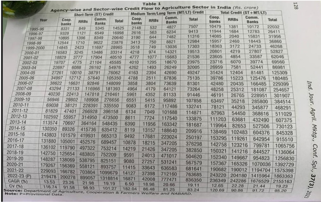 - Agency wise credit flow to agriculture from 95-96 to 20-23 as given in table 1. Indicates, that in 1995-96 co-operative banks purveyed highest amount of Rs 10,479 crore, closely followed by commercial banks. The share of RRB was much lower at Rs 139 crore